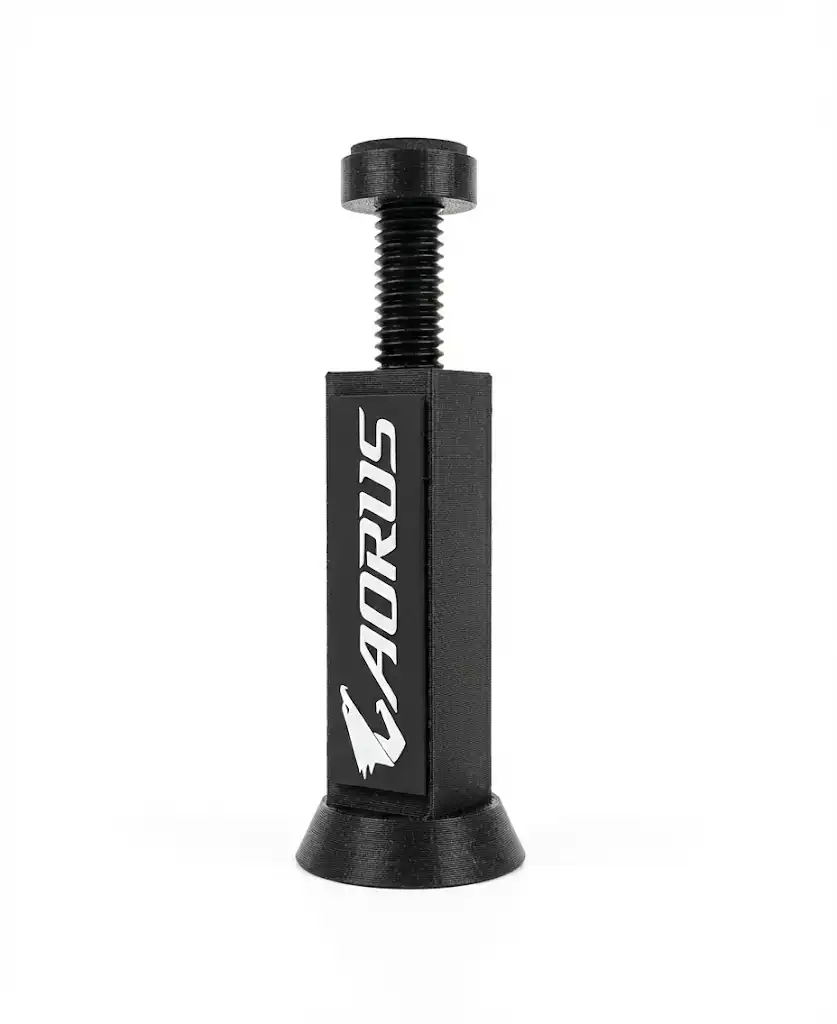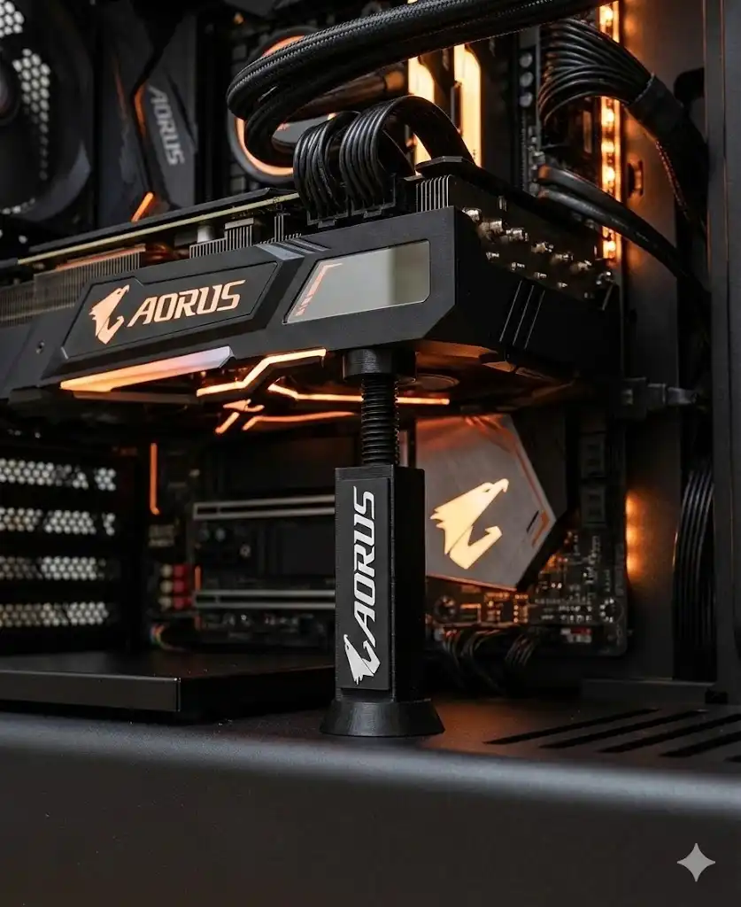 Featuring an AORUS-inspired design, this GPU support bracket blends perfectly with modern gaming setups. The adjustable screw-height mechanism allows precise positioning, ensuring strong vertical support for even the heaviest GPUs such as RTX and RX series cards.