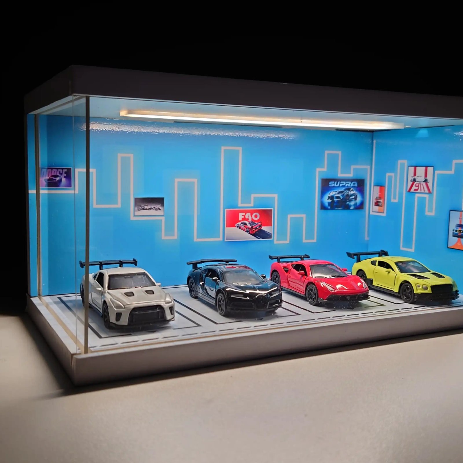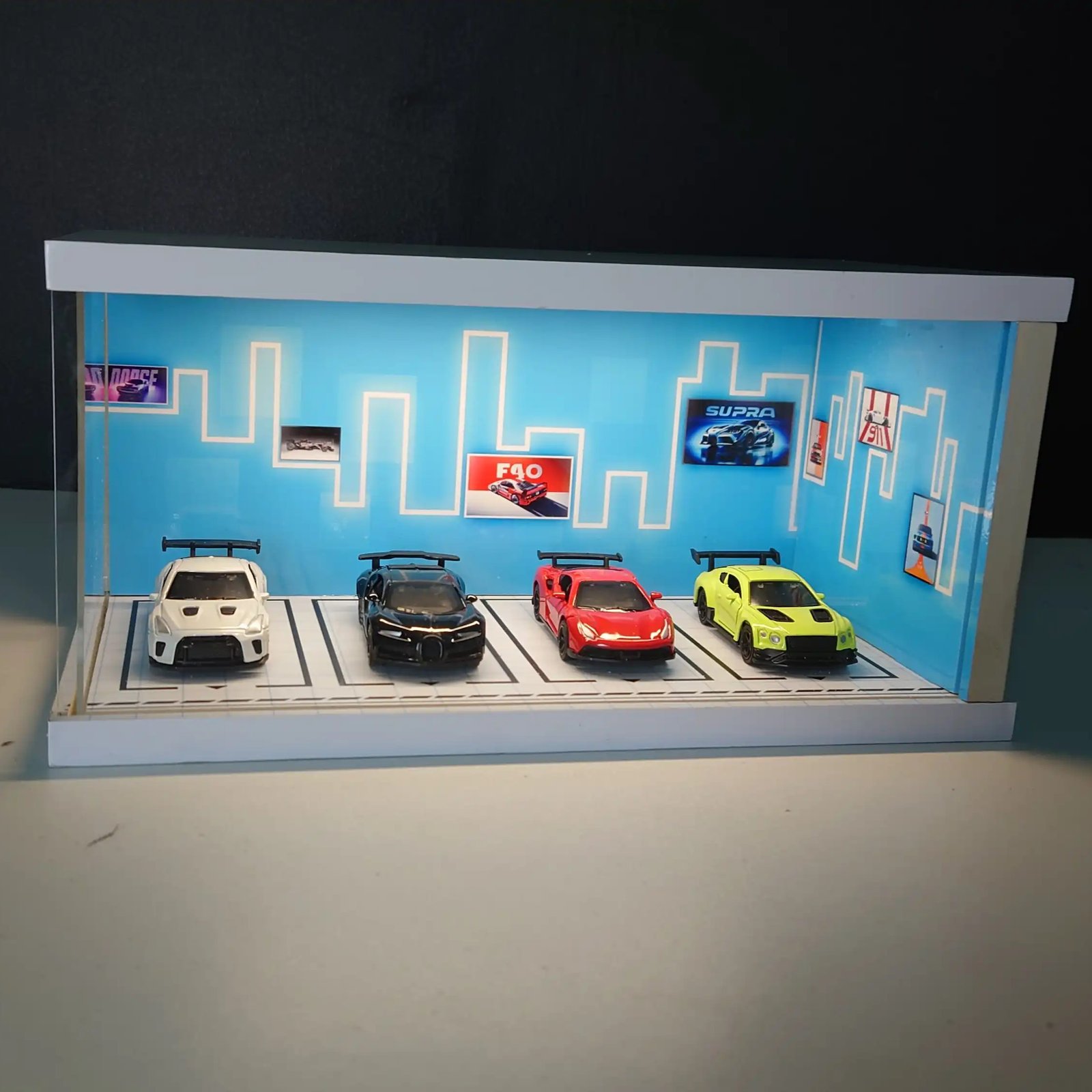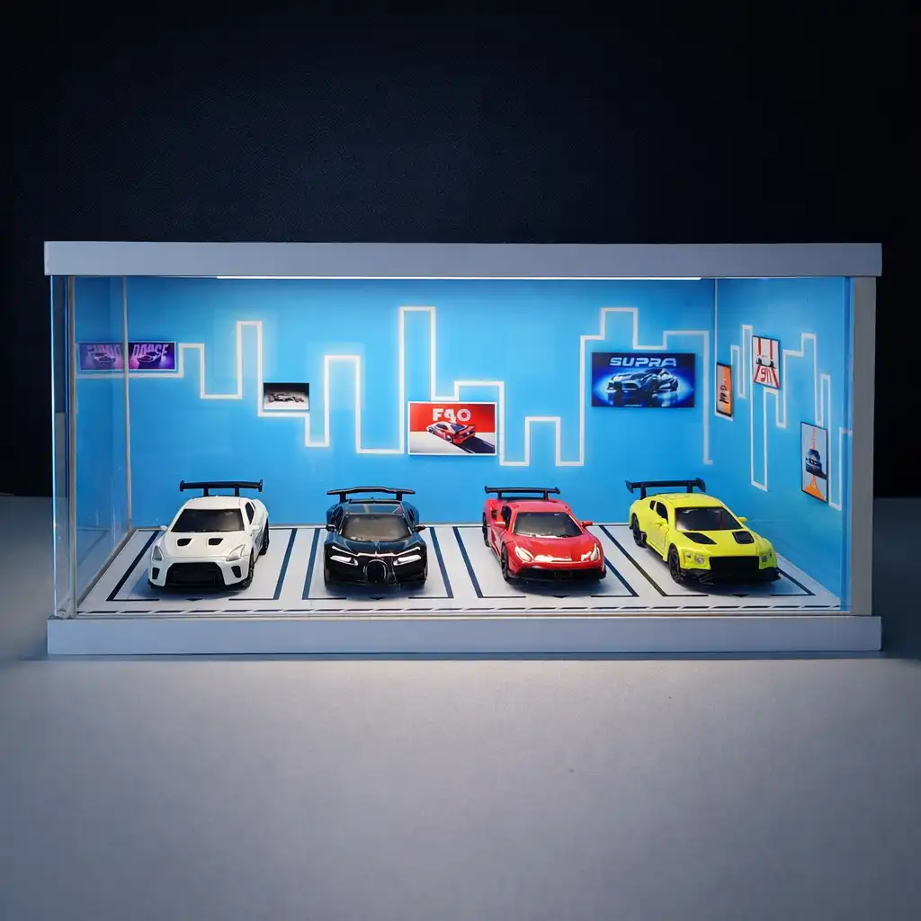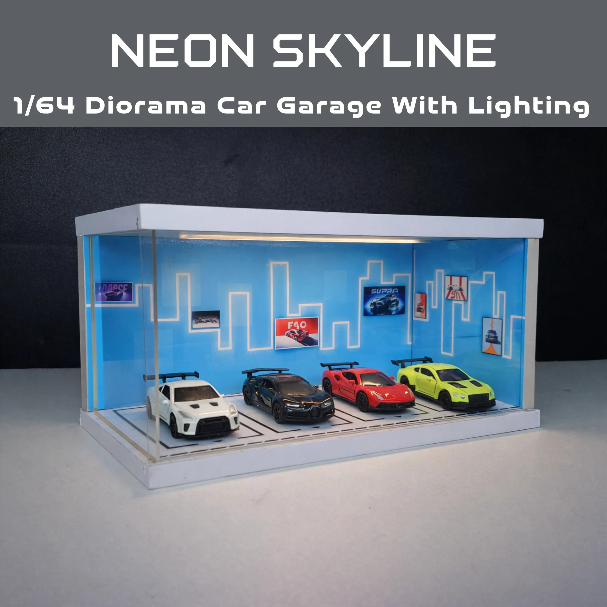 Neon Skyline Diorama Car Garage – Premium Display Setup for Diecast With Tri-Color Lighting